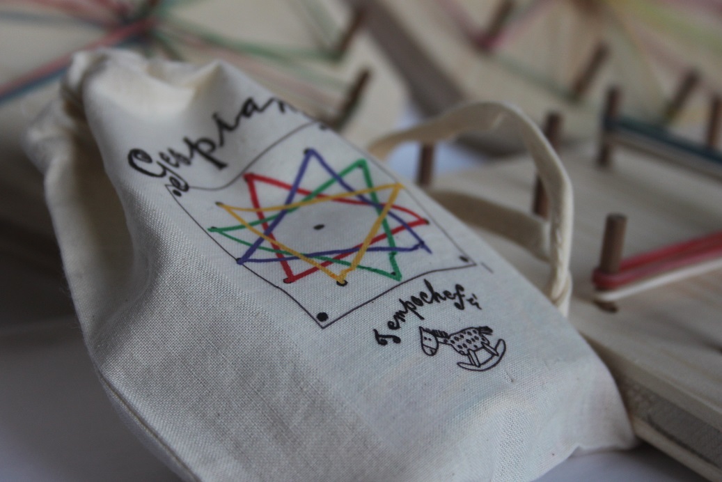 Il set comprende base di legno ottagonale o quadrata 15 x 15 cm, 12 pioli di legno messi in cerchio , più 1 centrale e nella versione quadrata 4 ai lati. Una bustina di cotone con 100 elastici colorati e istruzioni di gioco.