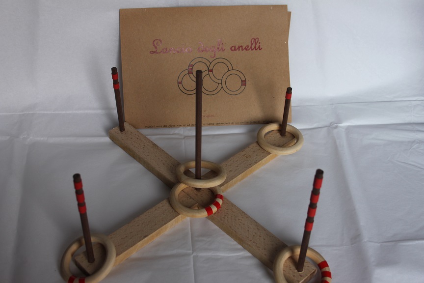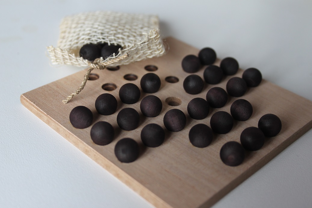 Solitario Classico base Chiara 12x12 cm, 32 palline tiglio tinto wengè.Confezione cartone ondulato, busta in juta per le palline,istruzioni su carta riciclata. Tutto prodotto e confezionato artigianalmente.